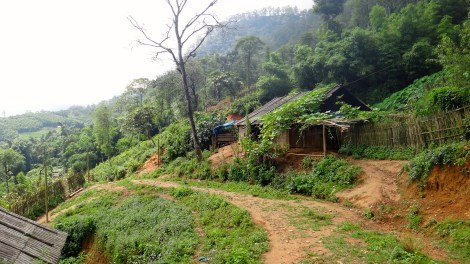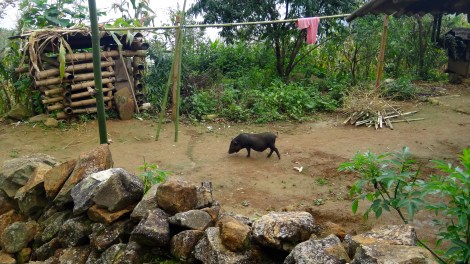 Later that afternoon we approached a little house on the hillside with goats and pigs on the left and a vegetable garden on the right. A woman on the porch waved as Sir said, “This is my mom’s house. Would you like to stop for a visit?” Of course. Her mom carefully swept any loose dirt from the porch and set down a wooden stool for us to sit on while Sir entered the small house where she was cheerfully greeted by her mother and a few young children. From the roof of the porch hung half a dozen bird cages with wild birds the family kept as pets and inside were three small rooms with bare dirt floors. The tidy home seemed quite pleasant under the warm sun that had finally succeeded in breaking through the clouds, but I can only imagine how difficult life must be for the H’Mong people when the air cools and snow covers the mountains in the winter.