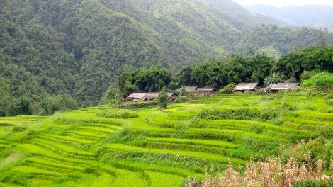 We spent the rest of the day walking. We walked through narrow forest trails, dirt roads and steep mountain paths, by vegetable gardens, corn fields and streams. We waved to children, yielded to buffalo and dodged piglets, cows and roosters as we passed through remote villages. We breathed in the fresh air and paused periodically to admire the distinctive terraced rice fields that covered the mountainside, like steps carved into the earth. Our guides had learned English from tourists and we chatted easily as they absentmindedly crafted animals and hearts from grass along the way.